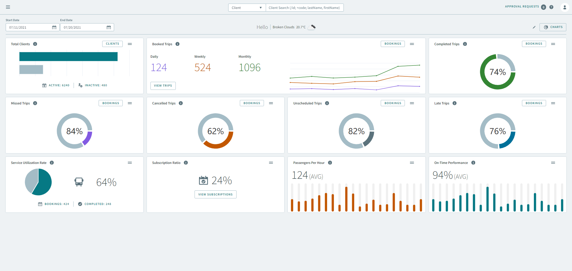 The OneMobility Dashboard is the first page you see after you login. The page provides Key Performance Indicators (KPIs) showing client, scheduling and booking metrics for the day, or for a specifed date range.