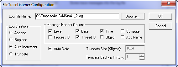 The FileTraceListener Configuration dialog box appears. This feature allows you to store the log files in the local server and in the largest partition available.