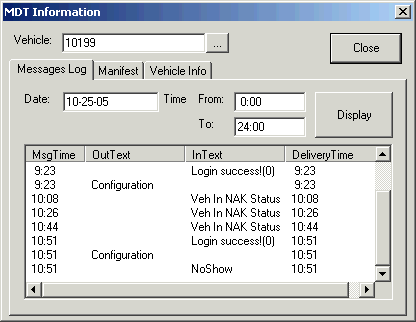 - Displays the client events for the selected vehicle and is used primarily for troubleshooting activities. For example, if a driver is missing a trip on the mobile computer, check the manifest. If the trip is there, the problem may reside with the communication between dispatch and the mobile computer.
