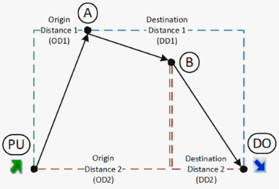 - The distance is measured using triangulation from A to the drop-off event (DO) to determine Destination Distance 1 (DD1)