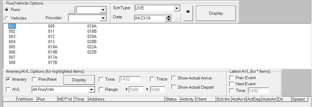 - Click to view itinerary and/or AVL data by run number.