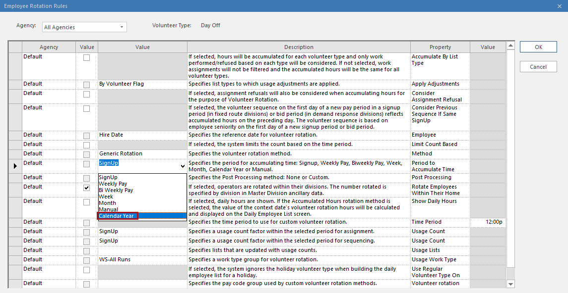 This allows users to define employee rotation rules for each extraboard or volunteer type and each individual agency (instead of for all agencies as a single group).