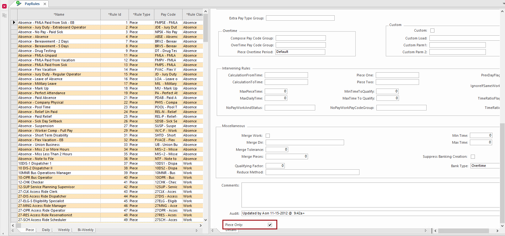 - Overtime section - Compose Pay Code Group: User-defined Pay Accessory ancillary group; the system uses the paycode work, piece, shift.
