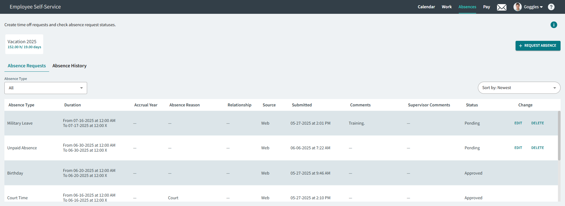 - Pending. Absence request is waiting for review.