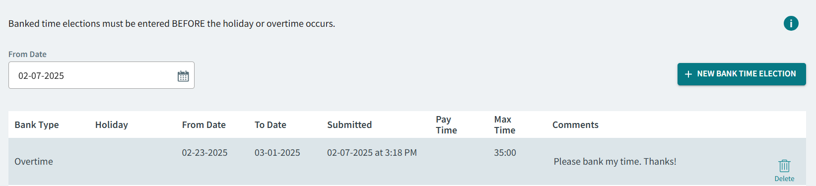 - Optional: To delete a banked time election record, select Delete.