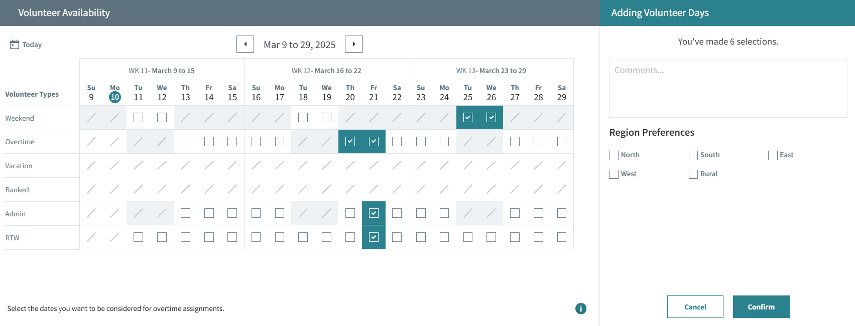 - Optional: To edit the volunteer request, select the volunteer card on the date, select Edit Request, and then update the Comments or Region Preferences. Select Update and then Close.