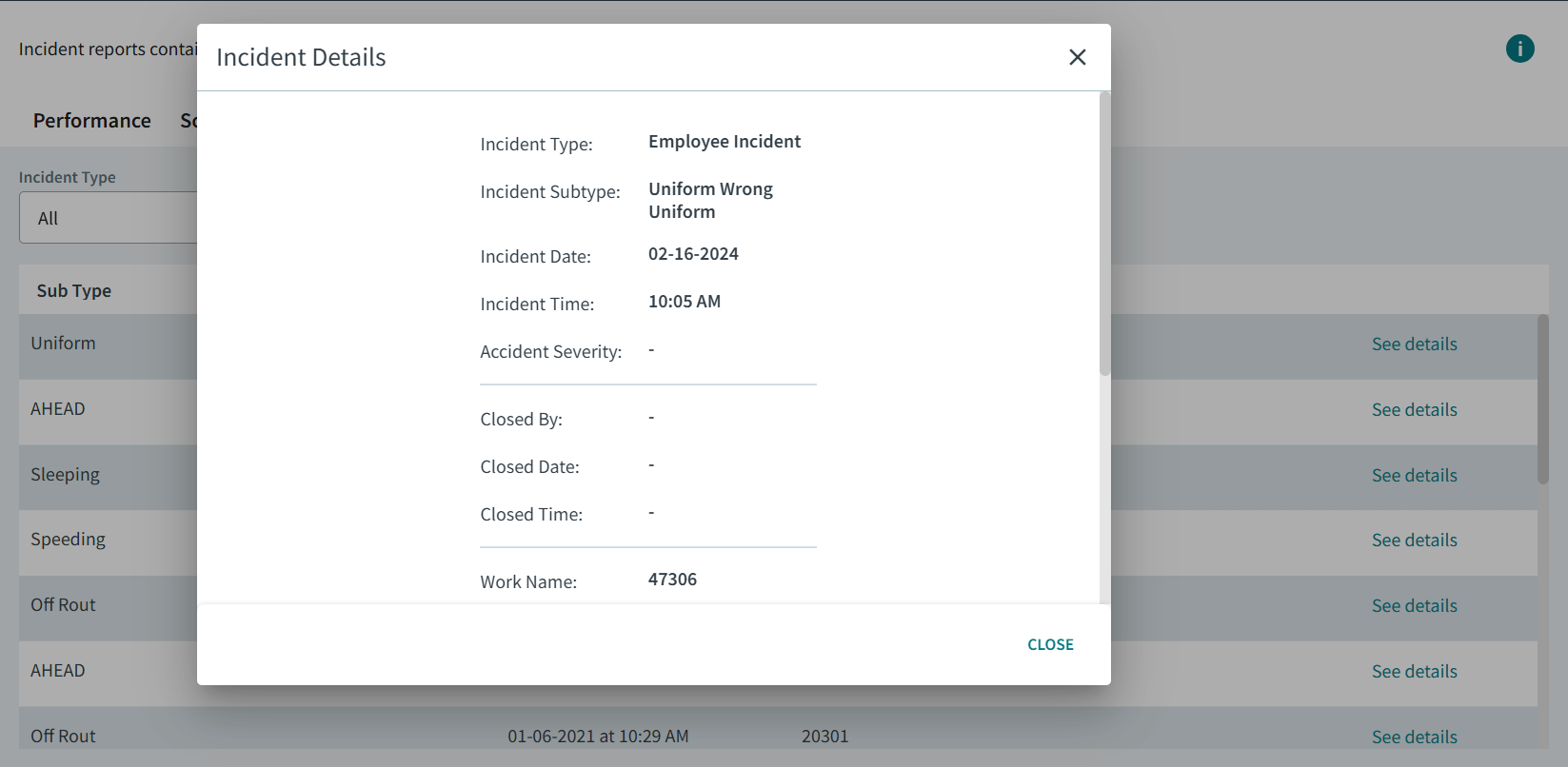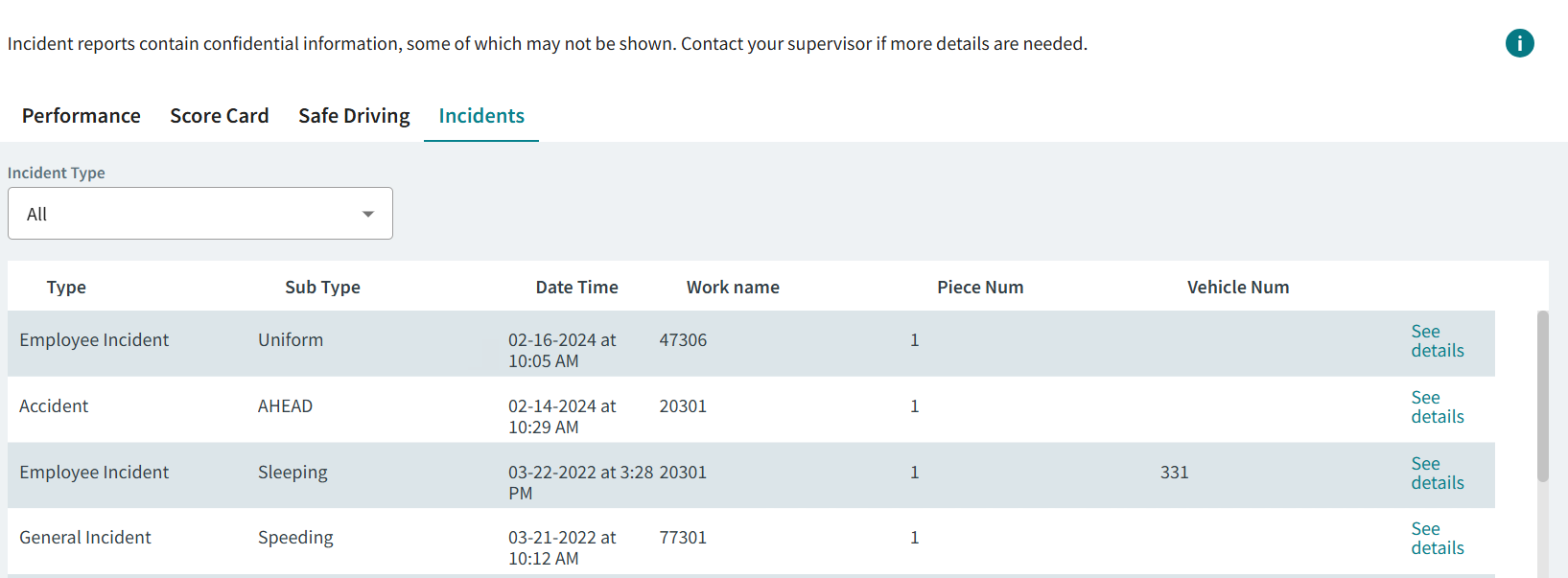 You can view information about your accidents, employee incidents, or general incidents.