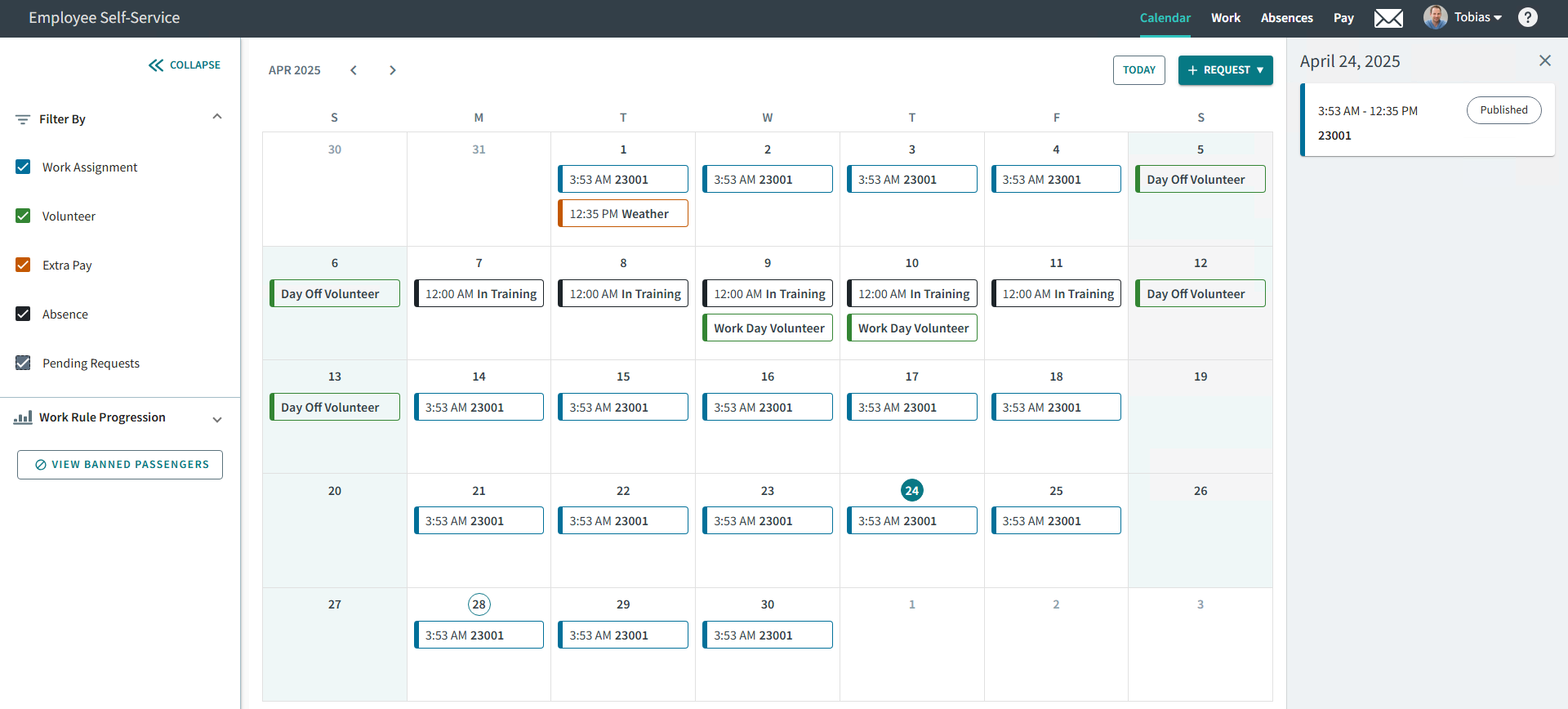 The Calendar page is your landing page after logging in to Employee Self-Service.