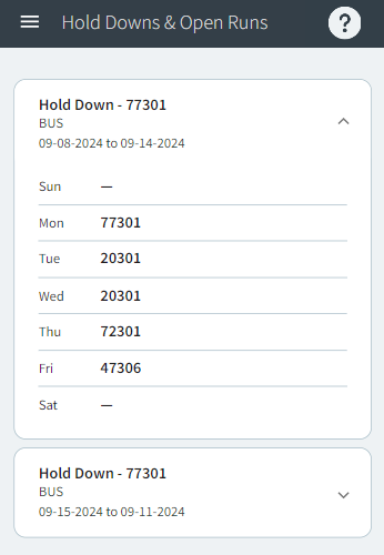 Depending on system configuration, you may see hold-down runs for the coming week or runs to the end of the sign-up period. System configuration also defines the work type of the runs that are shown. -