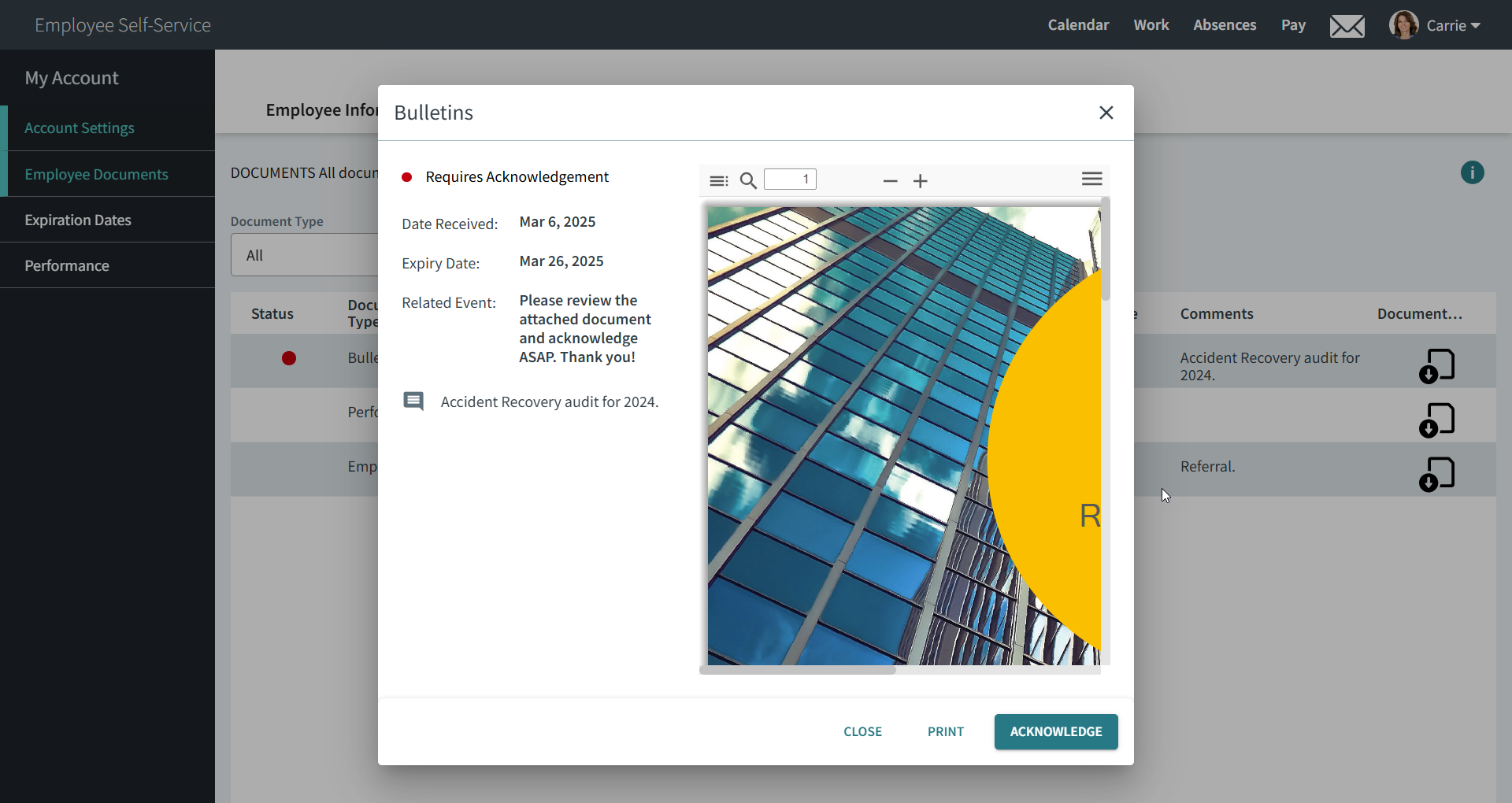 When document bulletins are acknowledged, employees are acknowledging the bulletin, not the document. Best practice is to attach one document per document bulletin. If multiple documents are added to a bulletin, they should be added at the same time. If more documents need to be added at a later time, new bulletins should be created, in case the employee has already read and acknowledged the existing bulletin. To see who has already acknowledged the bulletin, use the Bulletin Acknowledgement feature.
